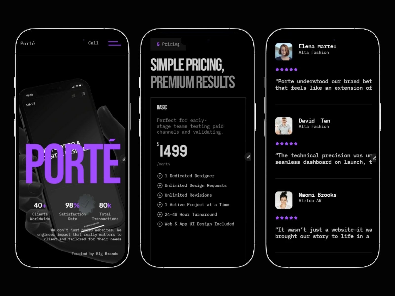 Portè is a bold Framer template for web and app studios, packed with fullscreen layouts, big type, and smooth motion.